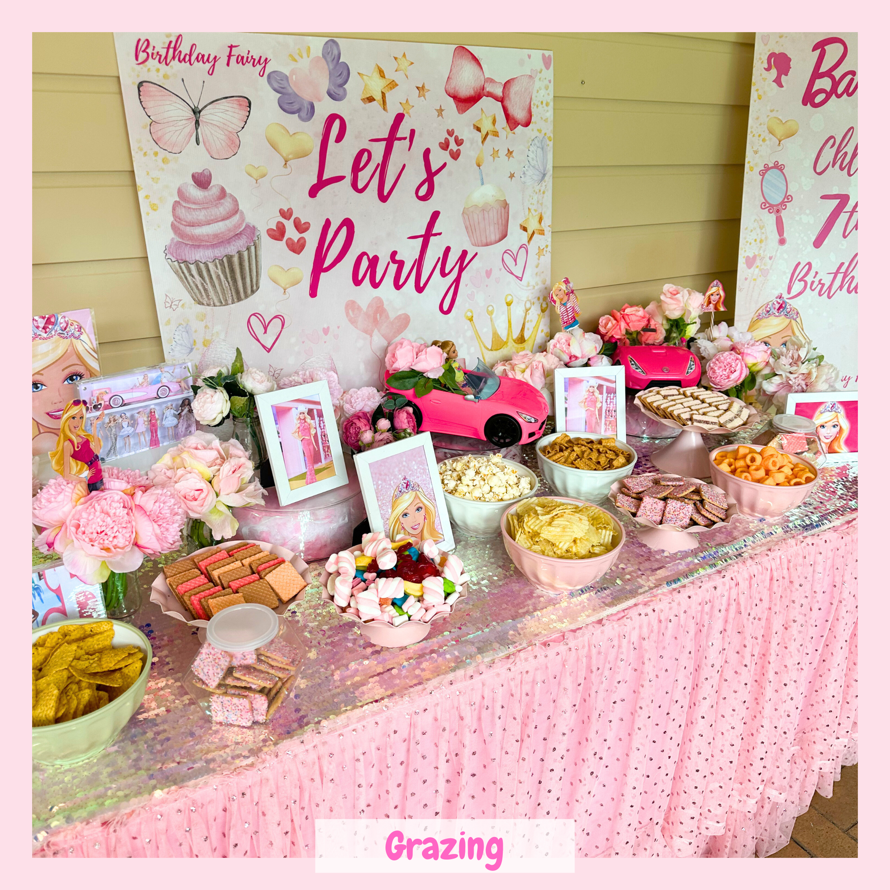Themed grazing table with a backdrop, themed decorations, cake stands, silk flowers and sequin cloths
