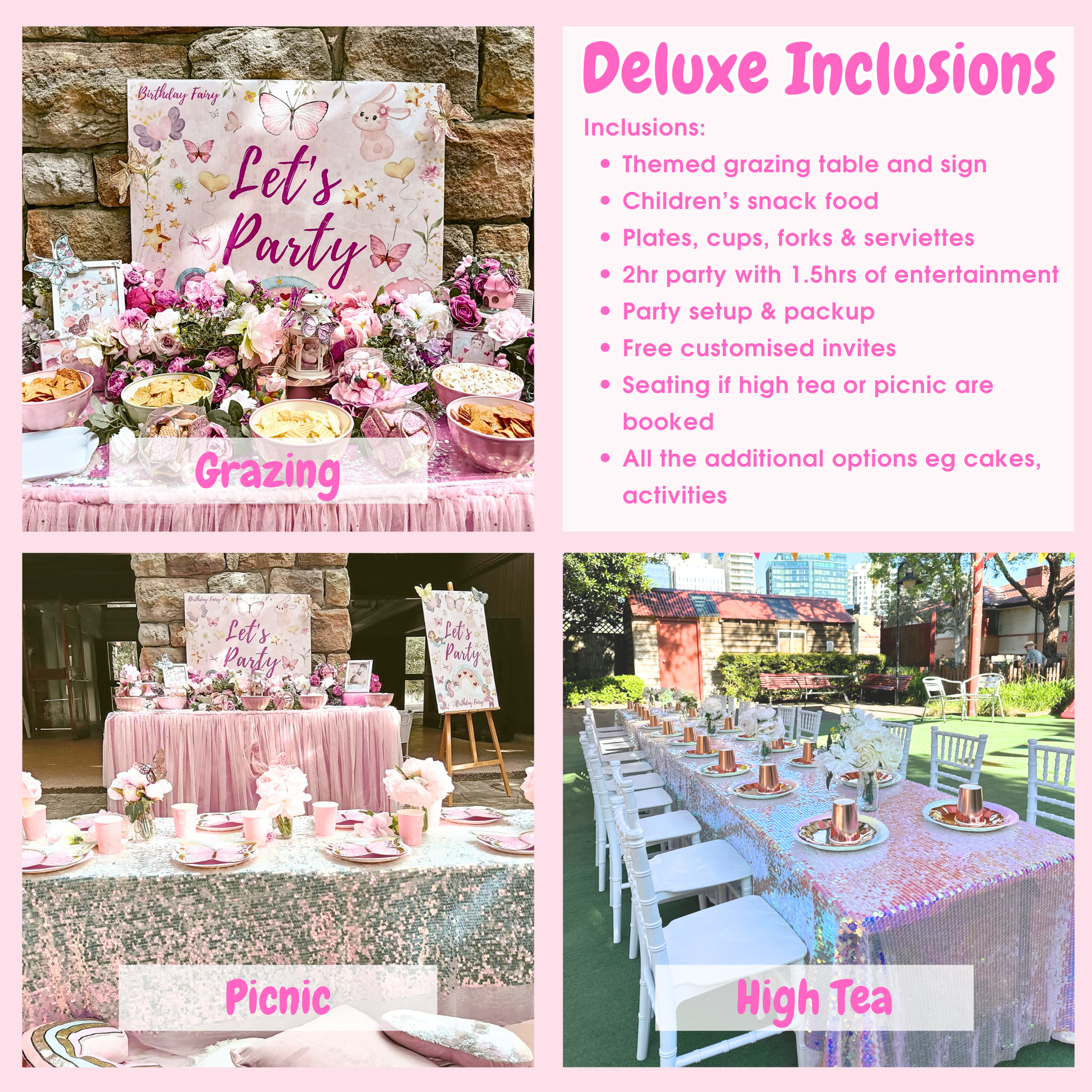 • Themed grazing table with a backdrop, themed decorations, cake stands, silk flowers and sequin cloths