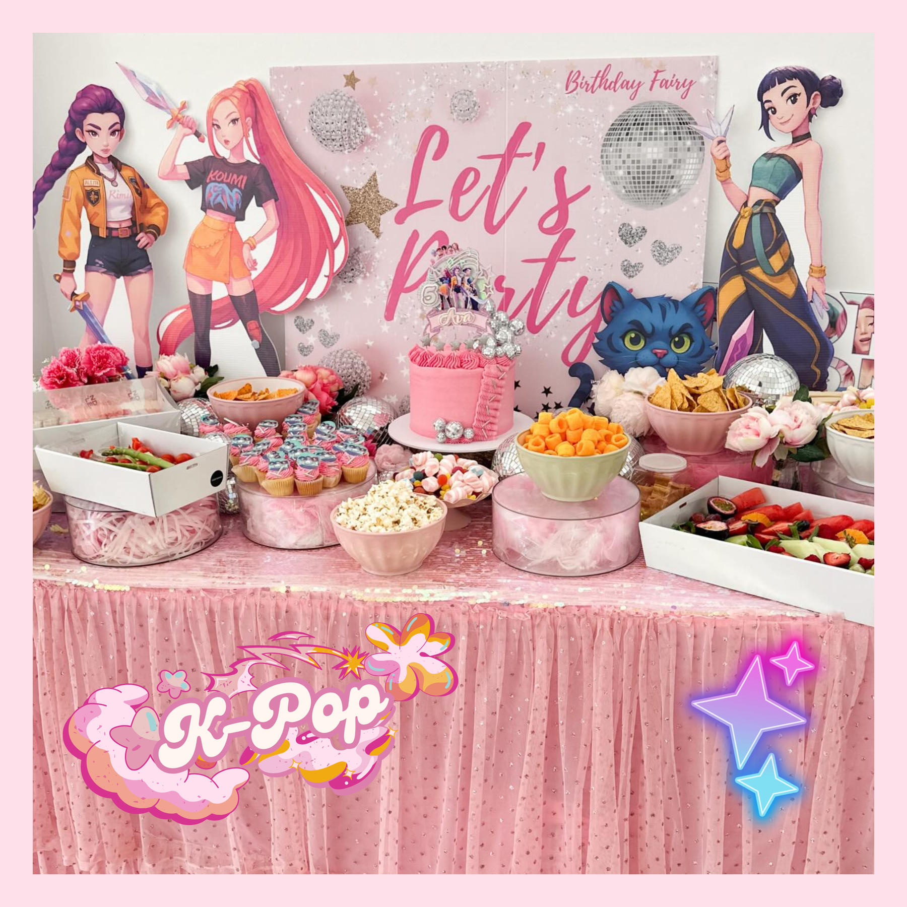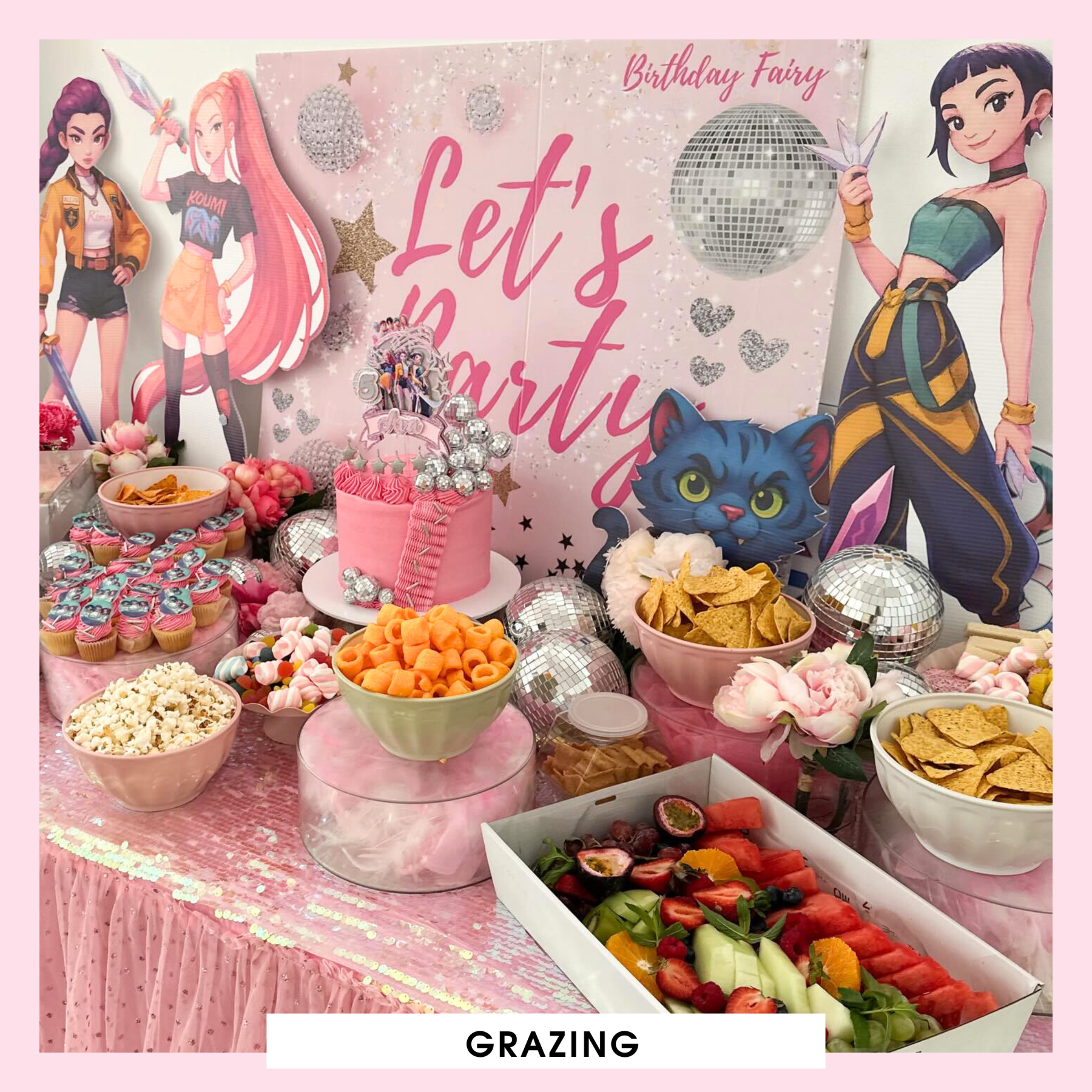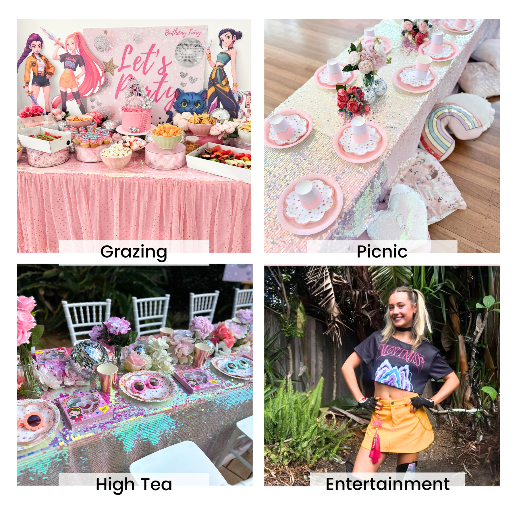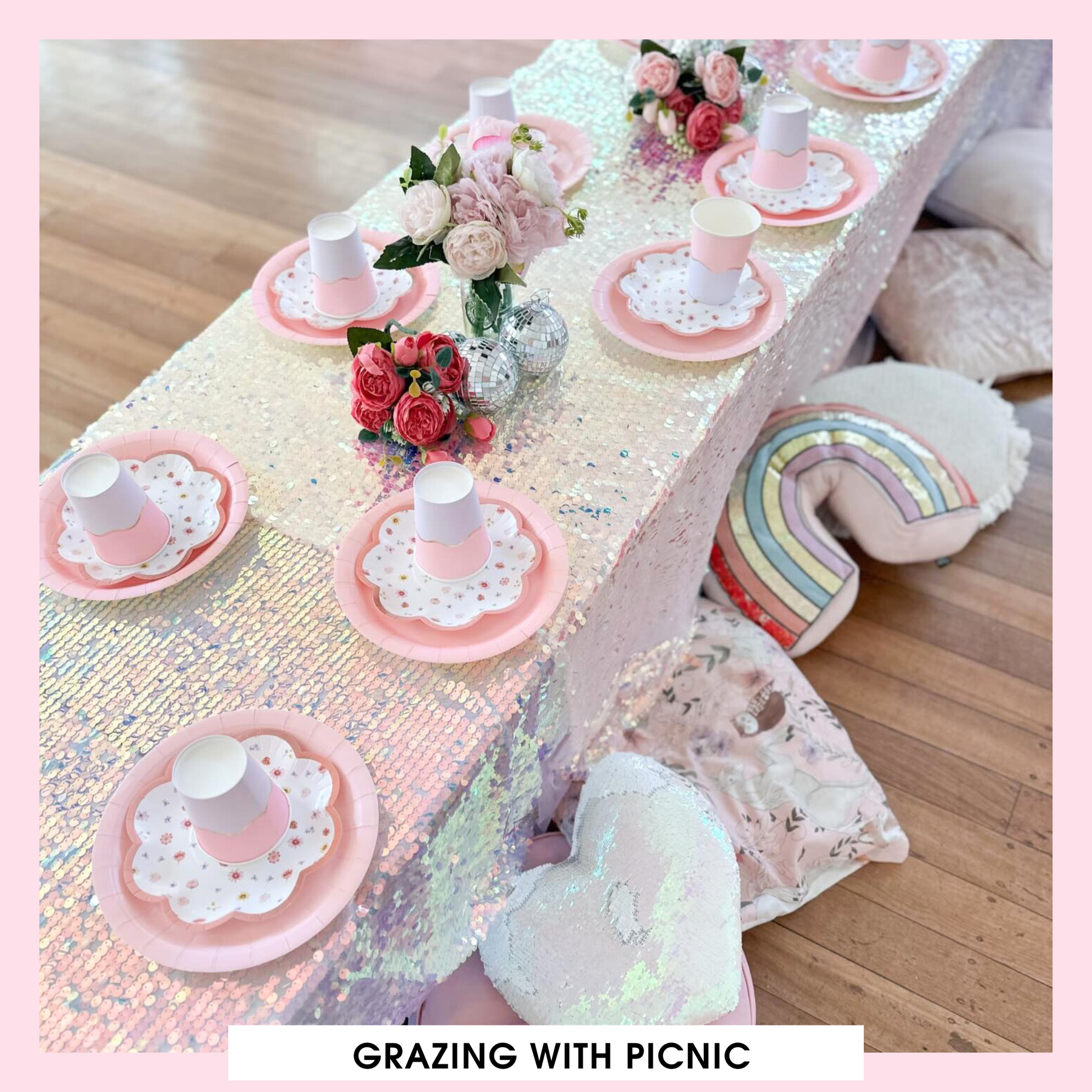 Themed grazing table with a backdrop, themed decorations, cake stands, silk flowers and sequin cloths
