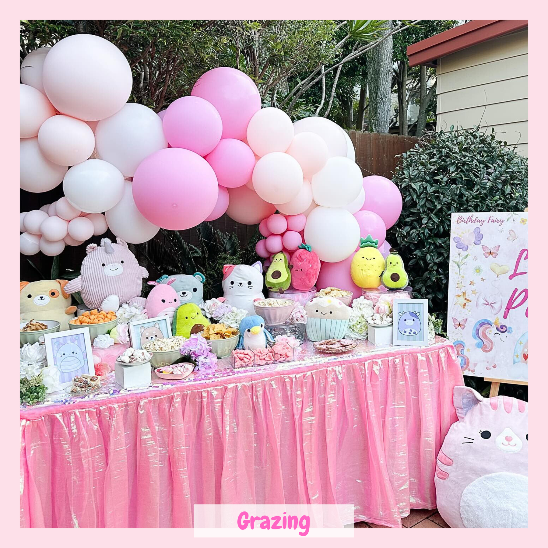 Themed grazing table with a backdrop, themed decorations, cake stands, silk flowers and sequin cloths