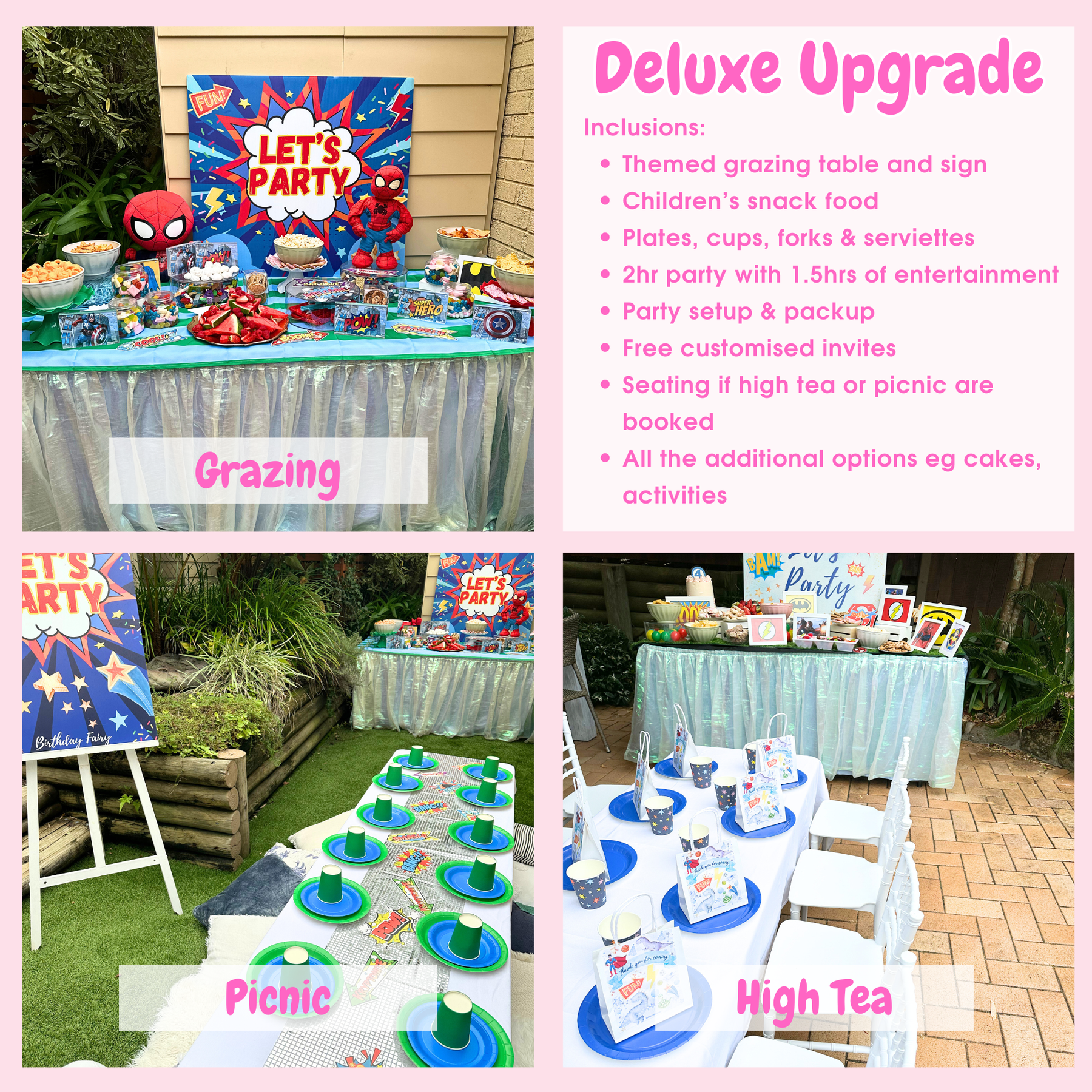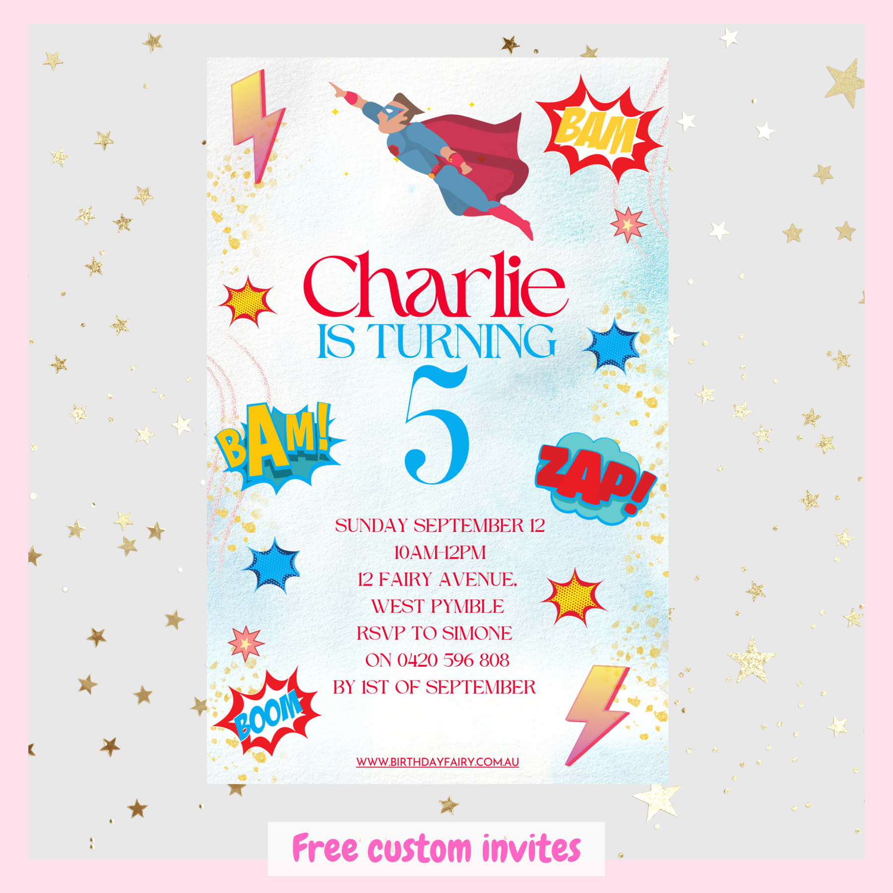 - Customised Superhero themed invites which you can print, email or text to your guests