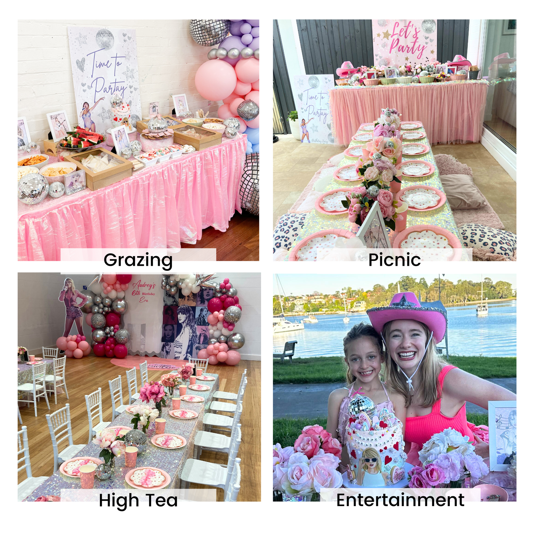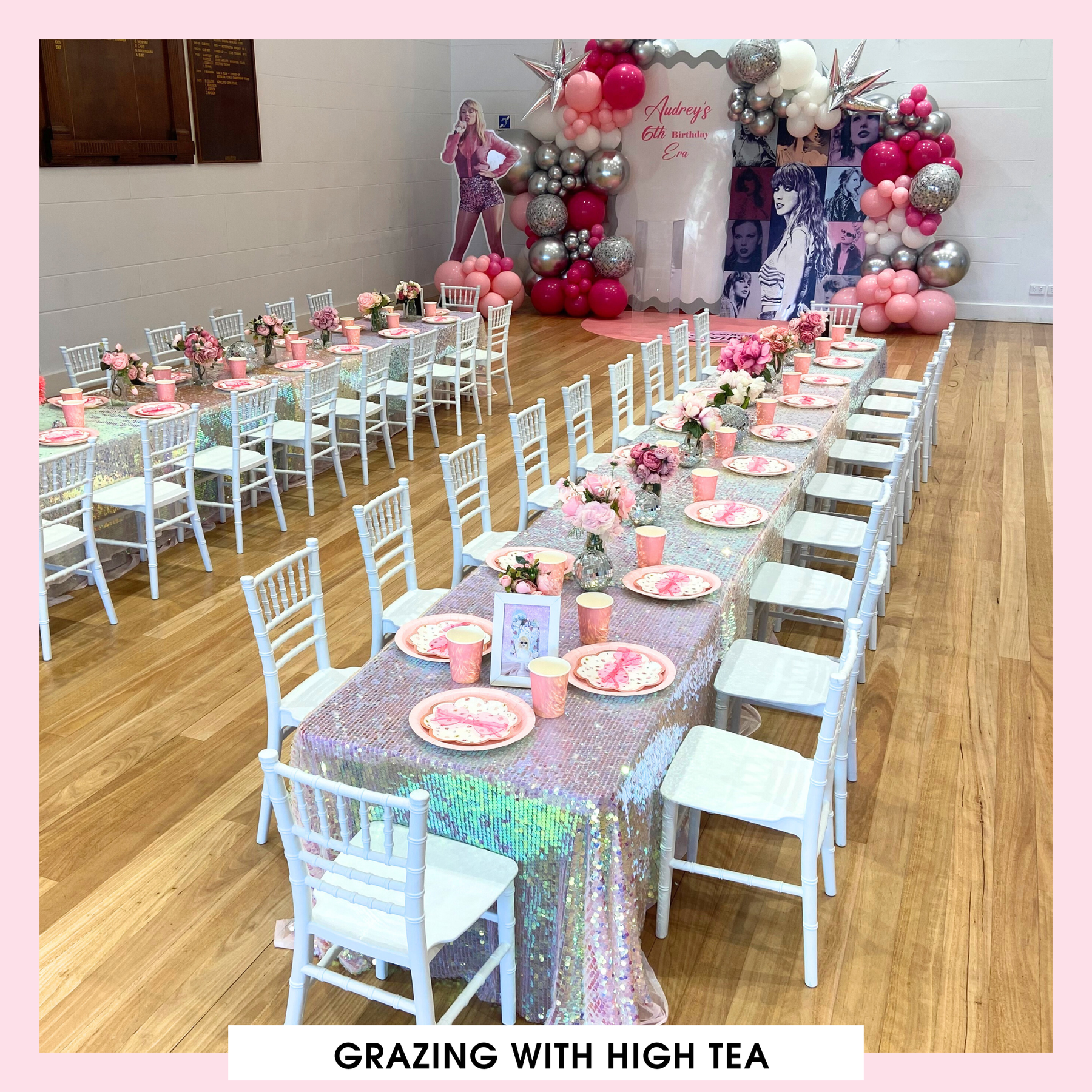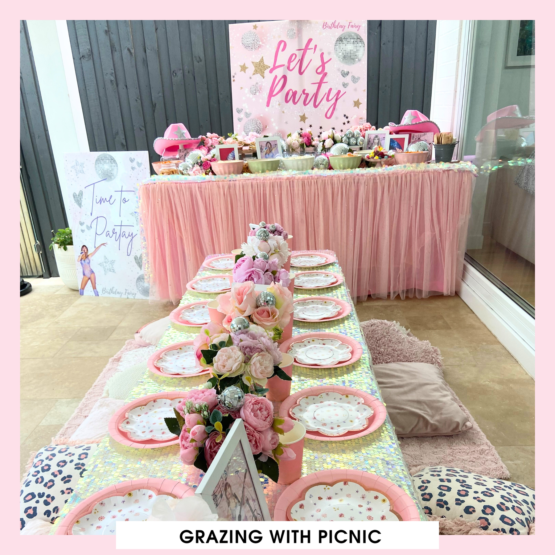 • Themed grazing table with a backdrop, themed decorations, cake stands, silk flowers and sequin cloths