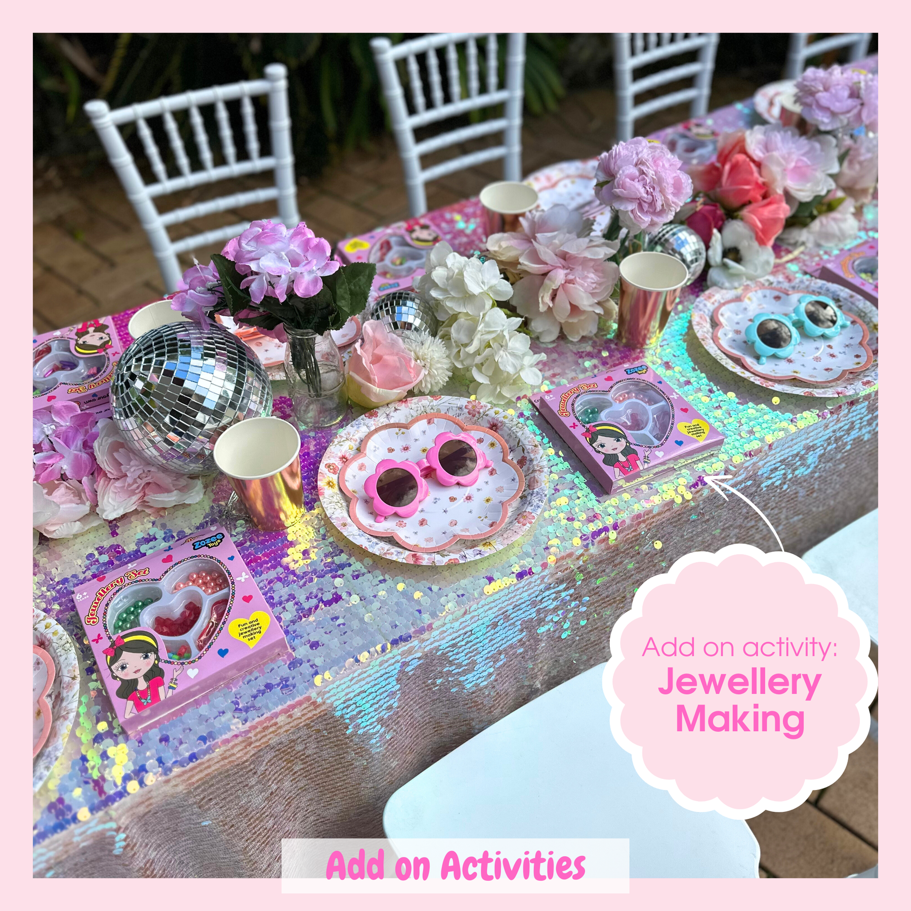 If you could please provide table and plastic cloth for each activity. Tables can be hired from us at an additional cost with any deluxe package (grazing, picnic or high tea). Standing for children is fine, they do not require chairs.