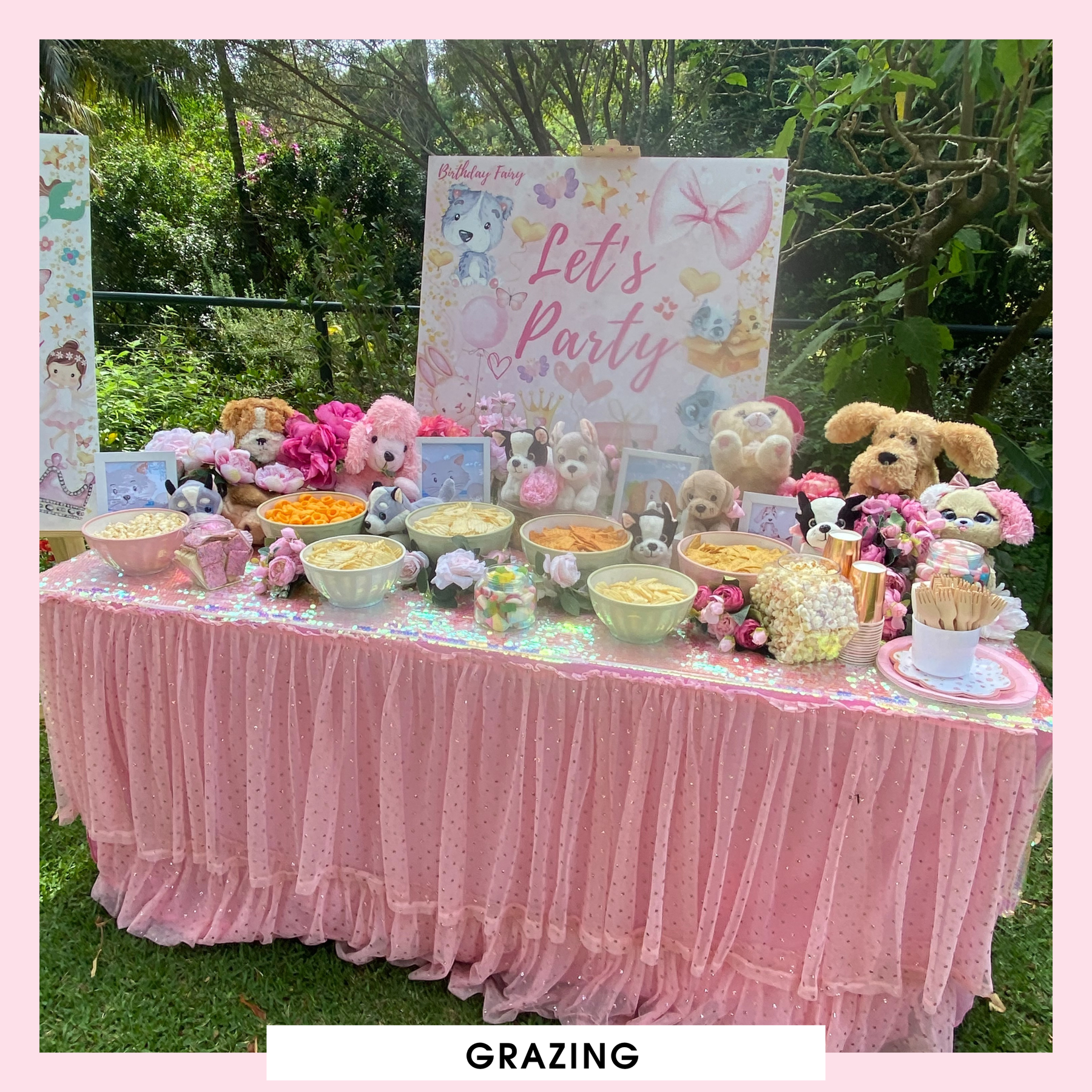 • Themed grazing table with a backdrop, themed decorations, cake stands, silk flowers and sequin cloths