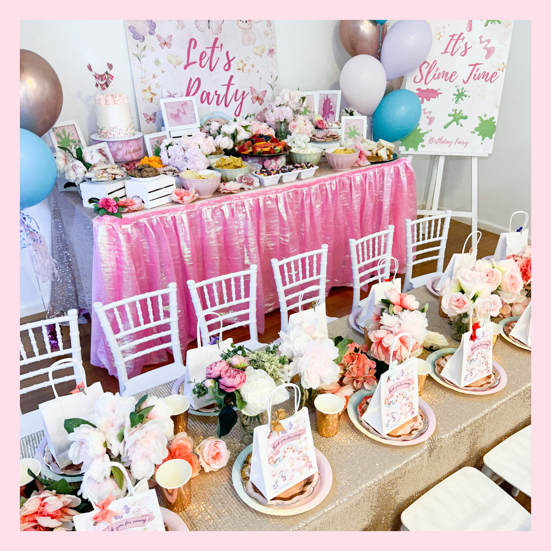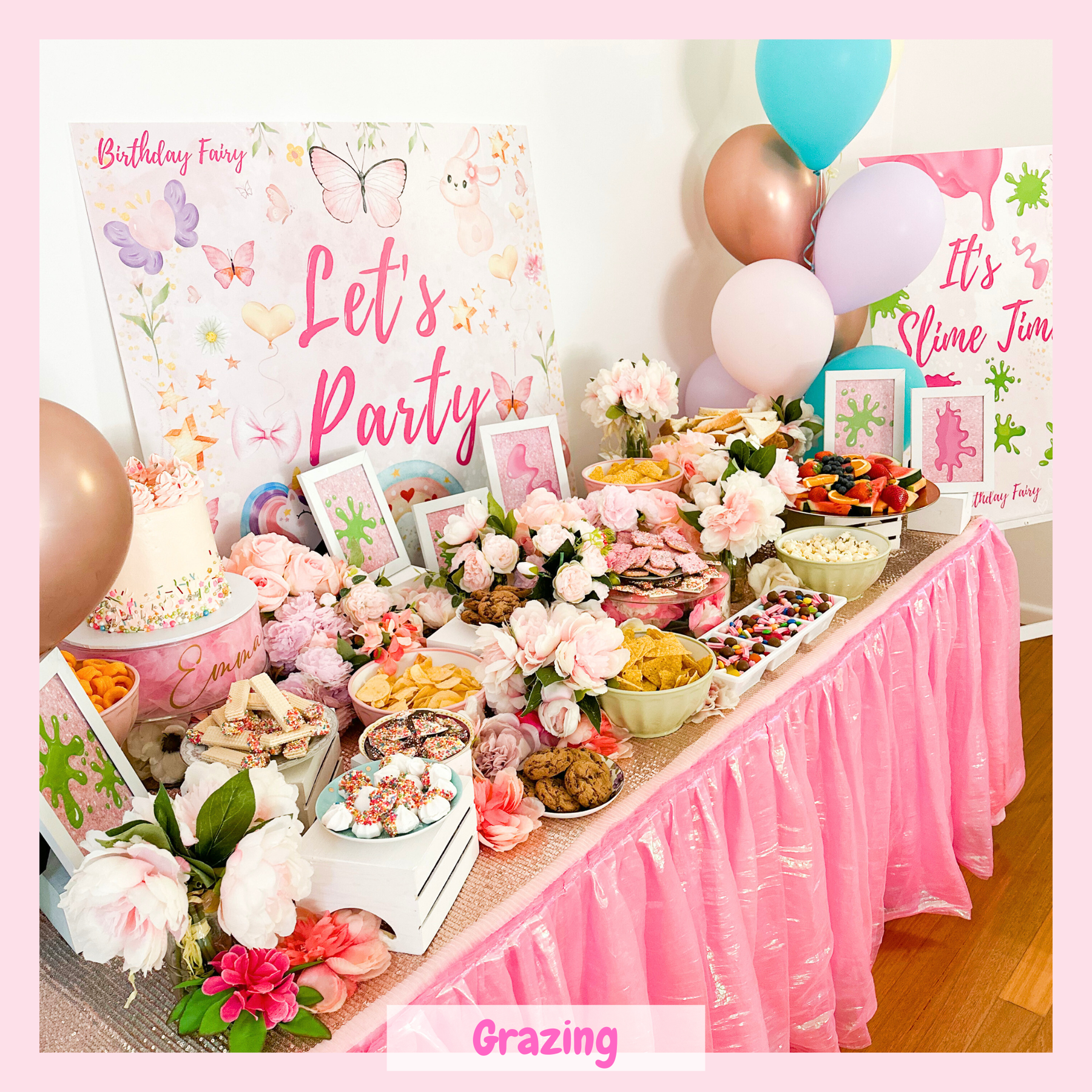Themed grazing table with a backdrop, themed decorations, cake stands, silk flowers and sequin cloths