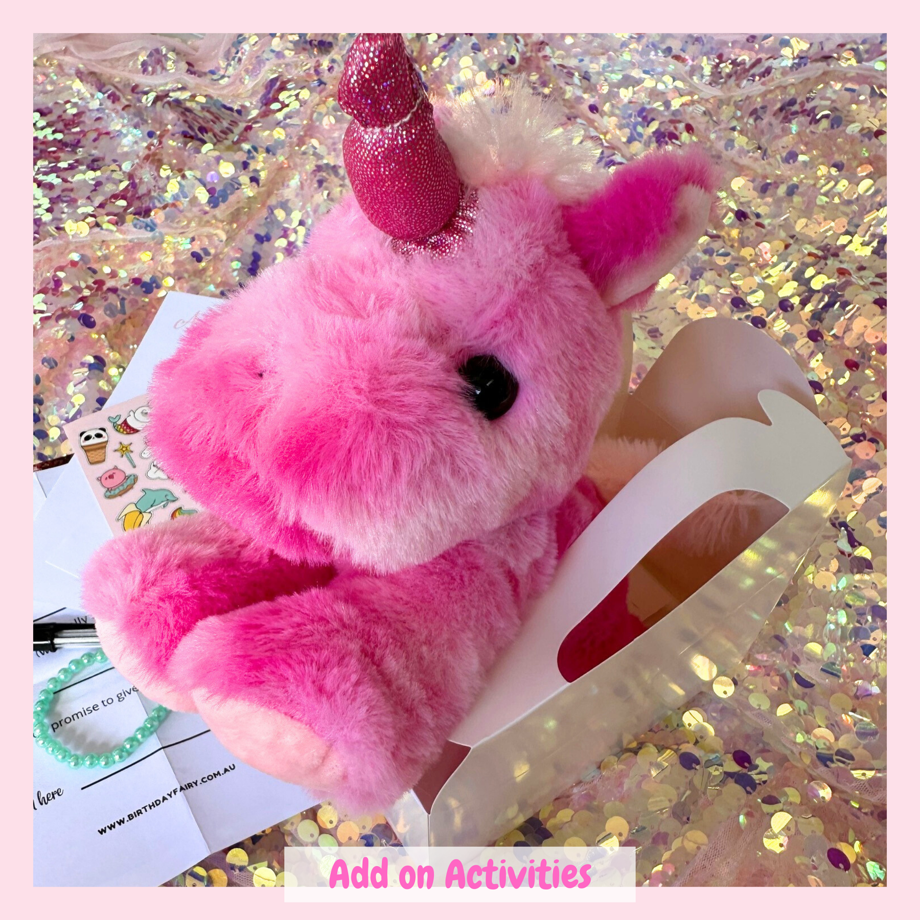 The plush unicorn can vary - we use a range of different (all gorgeous) unicorns!